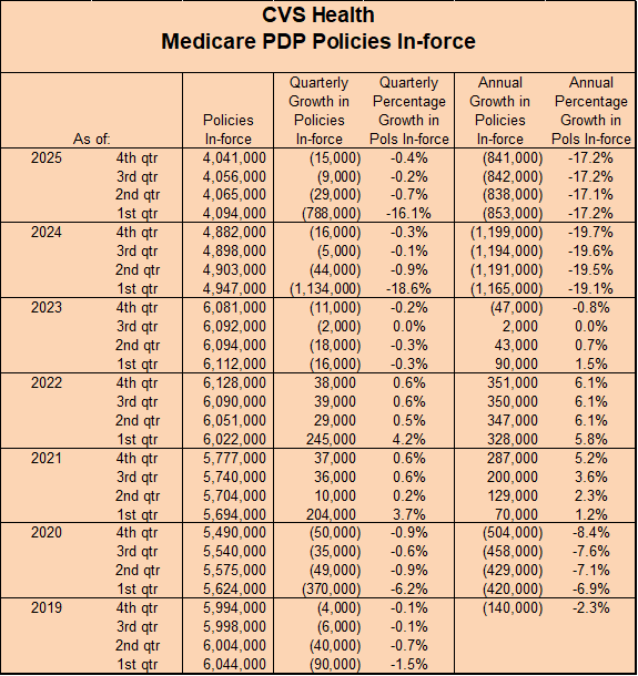 CVS Health reported 4th quarter 2025 Medicare PDP lives of 4,041000, a 0.4% decrease over 3rd quarter 2025 and a 17.2% decrease over 4th quarter 2024. The table below shows CVS Health’s Medicare PDP enrollment counts by quarter since 1st quarter 2019.