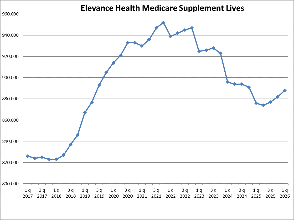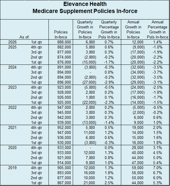 Elevance Health (formerly Anthem, Inc.) released 1st quarter 2026 financials on April 22nd, reporting an increase of 6,000 Medicare Supplement lives in the 1st quarter and an increase of 12,000 Medicare Supplement lives over the past 12 months. The Elevance Health enrollment table below features Medicare Supplement policy in-force counts of 888,000 as of 3/31/2026. The enrollment increase of 12,000 in the past 12 months is a 1.4% increase relative to the in-force lives at 3/31/2025. CSG Actuarial projects Elevance’s Medicare Supplement sales at 7th in the overall market in the past 12 months.