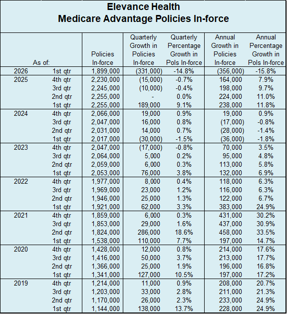 This Elevance Health enrollment table shows Medicare Advantage enrollment counts of 1,899,000 as of 3/31/2026, a 356,000 decrease in the past 12 months. The 356,000 enrollment decrease in the past 12 months is a 15.8% decrease over the Medicare Advantage enrollment counts at 3/31/2025.