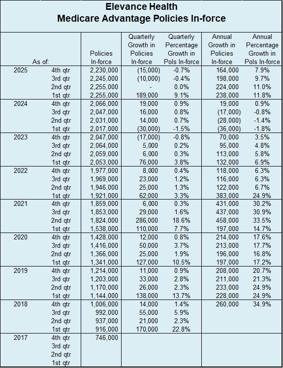 This Elevance Health enrollment table shows Medicare Advantage enrollment counts of 2,230,000 as of 12/31/2025, a 164,000 increase in the past 12 months. The 164,000 enrollment increase in the past 12 months is a 7.9% increase over the Medicare Advantage enrollment counts at 12/31/2024.