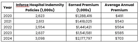 As previously shared, itβs also a growing line of business. Earned premium for individual hospital indemnity business topped $2 billion for the first time in 2024. Earned premium growth has averaged 14% per year since 2020, and annual inforce count growth averaged 4% per year over that same timeframe. An especially exciting development in 2024 for carriers participating in this market: not only did the volume of business increase significantly, but the average per-policy premium also increased at the same time, topping $700 for the first time.