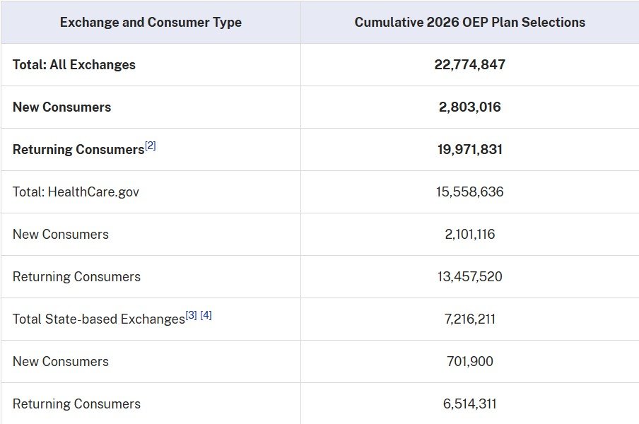 The Centers for Medicare & Medicaid Services (CMS) reports that 22.8 million consumers have signed up for 2026 individual market health insurance coverage through the Marketplaces since the start of the 2026 Marketplace Open Enrollment Period (OEP) on November 1, 2025. This includes 15.6 million Marketplace plan selections in the 30 states using the HealthCare.gov platform for the 2026 plan year and 7.2 million plan selections in the 20 states and the District of Columbia with state-based Exchanges (SBEs) that are using their own eligibility and enrollment platforms. Total nationwide plan selections include 2.8 million consumers who are new to the Marketplaces for 2026, and 20.0 million consumers who had active 2025 coverage and selected a plan for 2026 coverage or were automatically re-enrolled.