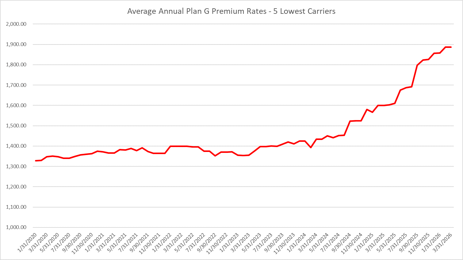 As noted in previous posts, average premiums for Plan G have increased markedly in the past 2 1/2 years and that trend is continuing into 2026. The chart below shows the average Plan G premium rates by year for the five most competitive carriers as of each month. The Plan G average premiums for the five most competitive carriers were flat around $1,400 for 2020 through early 2024 but have steadily increased the past 24 months and now average almost $1,900 as of 3/31/2026, which is a 35% increase over the past two years.