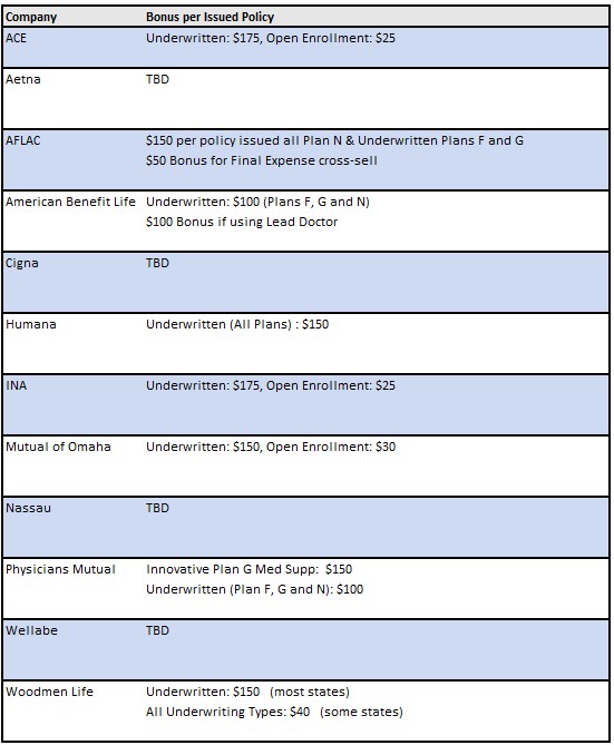 Insurance companies that operate in the brokerage Medicare Supplement market typically offer per policy bonuses to encourage agents to sell their products. These bonuses generally vary by underwriting type to assist in achieving an appropriate mix of business.