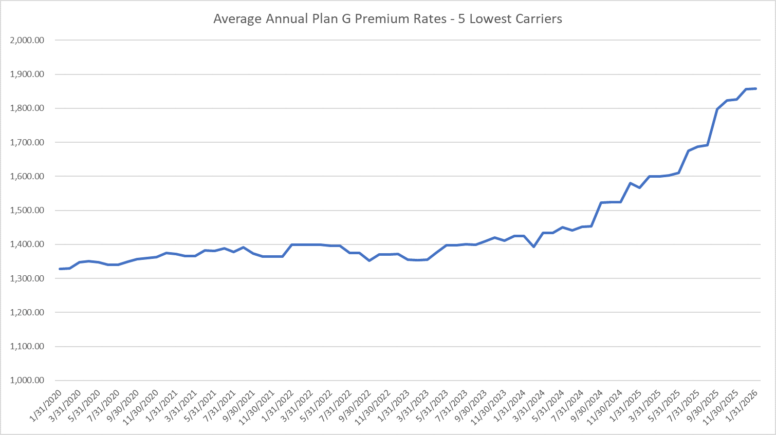 As noted in previous posts, Plan G average premiums have increased markedly in the past 2 1/2 years and that trend appears to be continuing into 2026. The chart below shows the average Plan G premium rates by year for the five most competitive carriers as of each month. The Plan G average premiums for the five most competitive carriers were flat around $1,400 for 2020 through early 2024 but have increased substantially the past 24 months and now average $1,850 as of 1/31/2026.