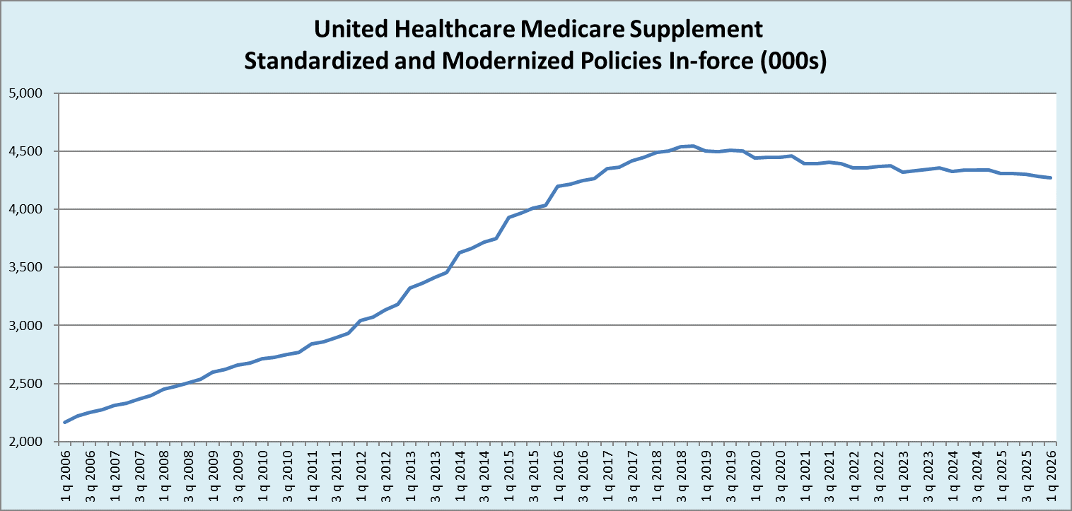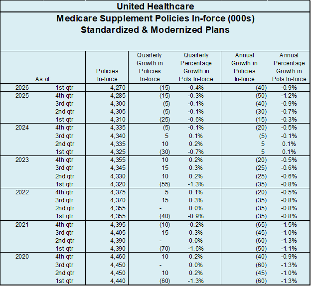 Medicare Supplement market leader United Healthcare (UHC) released 1st quarter 2026 financials on April 21st, reporting a 15,000 decrease in Medicare Supplement lives in 1st quarter. The UHC enrollment table below features Standardized and Modernized policy in-force counts of 4,270,000 as of 3/31/2026, which is a 40,000 decrease in the past 12 months and the lowest UHC Medicare Supplement in-force counts since 2016. UHC continues to hold the largest market share in the Medicare Supplement market by a wide margin.