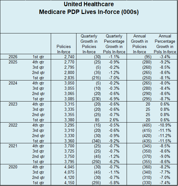 This UHC enrollment table shows Medicare PDP enrollment counts of 2,740,000 as of 3/31/2026, a 95,000 decrease in the past 12 months. The 95,000 enrollment decrease in the past year is a 3.4% decrease over the Medicare PDP enrollment counts as of 3/31/2025.