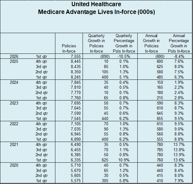 This UHC enrollment table shows Medicare Advantage enrollment counts of 7,555,000 as of 3/31/2026, a 690,000 decrease in the past 12 months. The 690,000 enrollment decrease in the past year is an 8.4% decrease over the Medicare Advantage enrollment counts as of 3/31/2025.